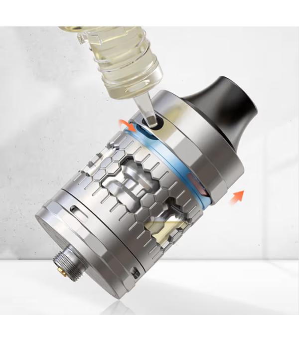 - Üst kapağı çevirerek dolum deliğini açın. Şemsiye yapısı e-likiti coil’e temas etmesini engeller.