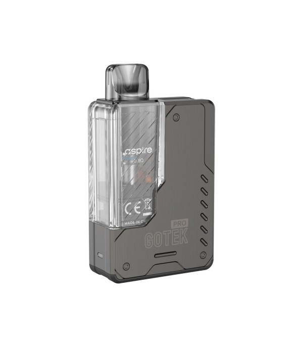 Aspire Gotek Pro Pod Mod koyu gri, şeffaf kartuşlu elektronik sigara.