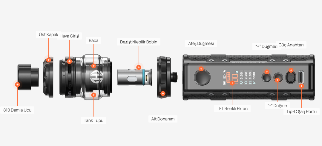 - Güçlü performans: 100W’a kadar esnek çıkış aralığı ile hem aroma hem de bulut performansında üst düzey verim.