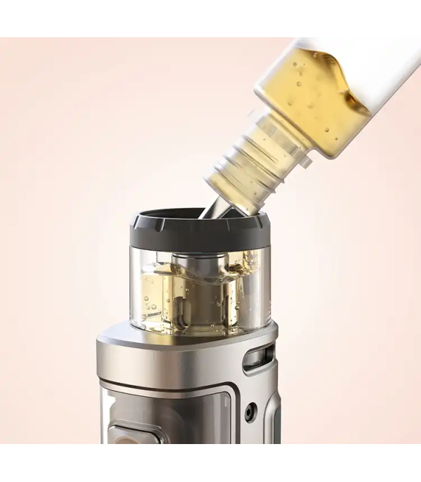 Aspire Revolto Pod Mod dolum prosedürü, likit şişesi ile tank dolum ağzı detayı.