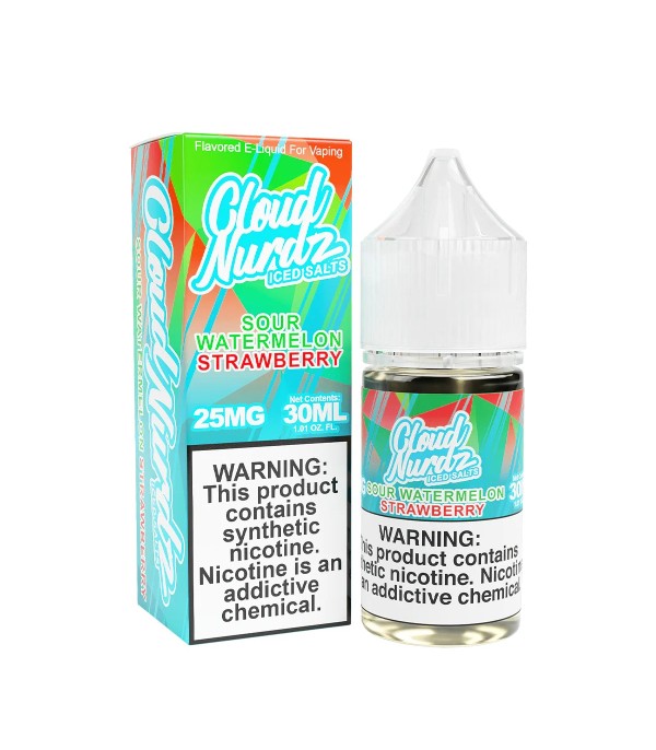 Cloud Nurdz Sour Watermelon Strawberry Iced Salt Likit, ekşi karpuz ve tatlı çilek aromalarını buz ferahlığıyla buluşturur. 30 mL, 25 mg / 50 mg nikotin seçenekleri, 60VG/40PG oranı.