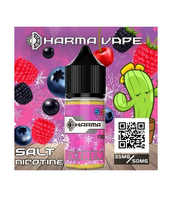 Dharma Extrem Salt Likit, karışık orman meyveli, pembe etiketli e-likit şişesi.