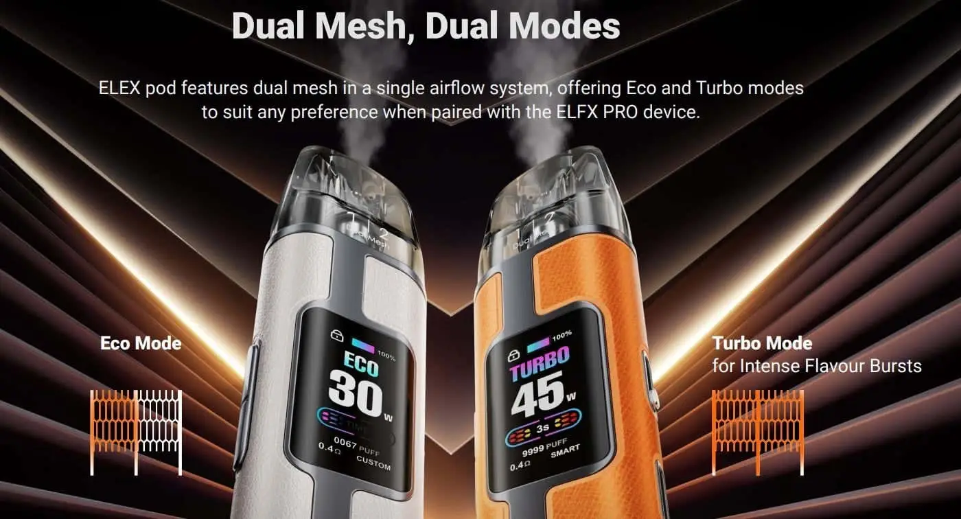 Elf Bar ELFX Pro Classic Edition Pod Kit, 1200mAh bataryası ve Dual mesh coil pod seçenekleriyle (0.6 Ohm ve 0.8 Ohm) hem aroma hem de buhar performansını dengeler. Boost ve Eco modları ile kullanıcı kontrolü sağlar; üstten dolum, sızdırmaz yapı, renkli ekran ve RGB göstergeleri ile şık ve pratik bir tercih olup günlük kullanım için ideal bir pod sistemidir.
