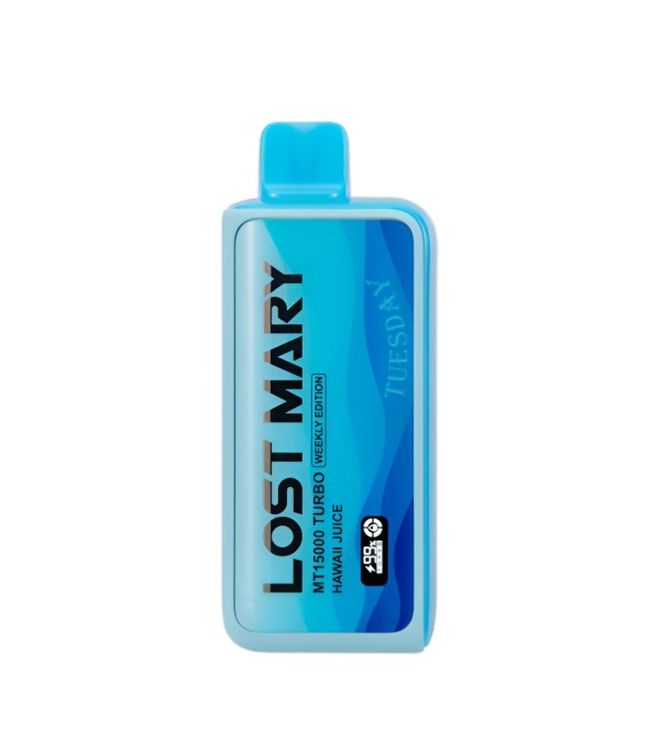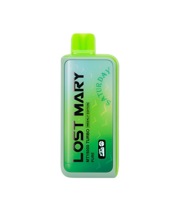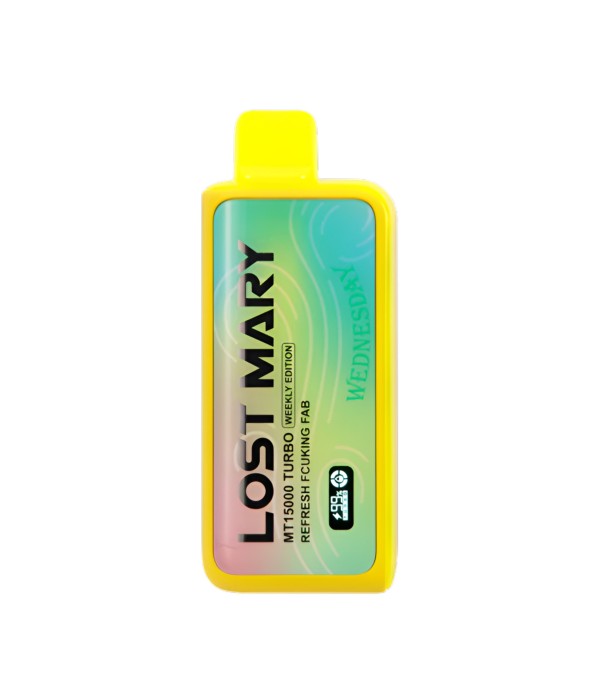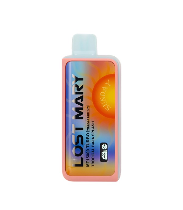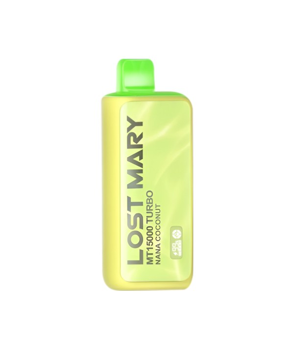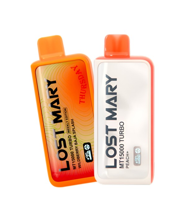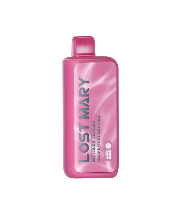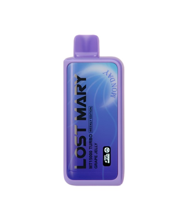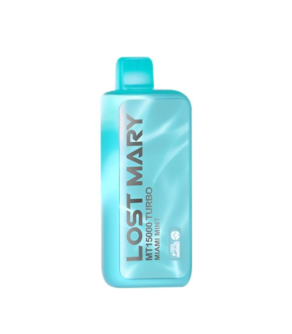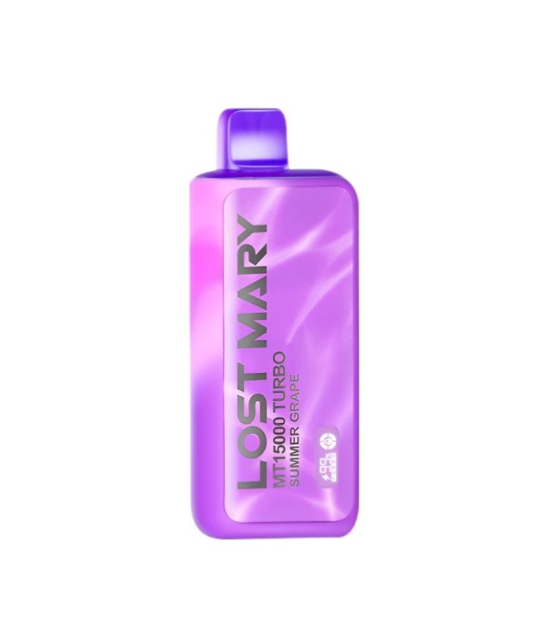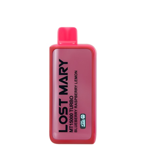 Lost Mary MT15000 Turbo, 15.000 pufa kadar kullanım, %5 nikotin (50 mg), 16 mL dolum, USB Type-C şarj, çift mesh coil ve LCD ekran ile uzun ömür ve yoğun aroma sunan şarj edilebilir kullan at elektronik sigaradır.
