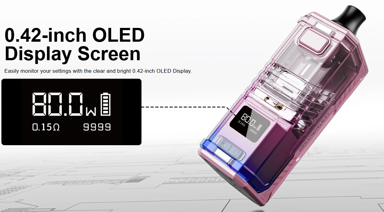 • 0.42″ OLED ekran — çıktı, direnç ve pil durumu gibi bilgileri net görselleştirir