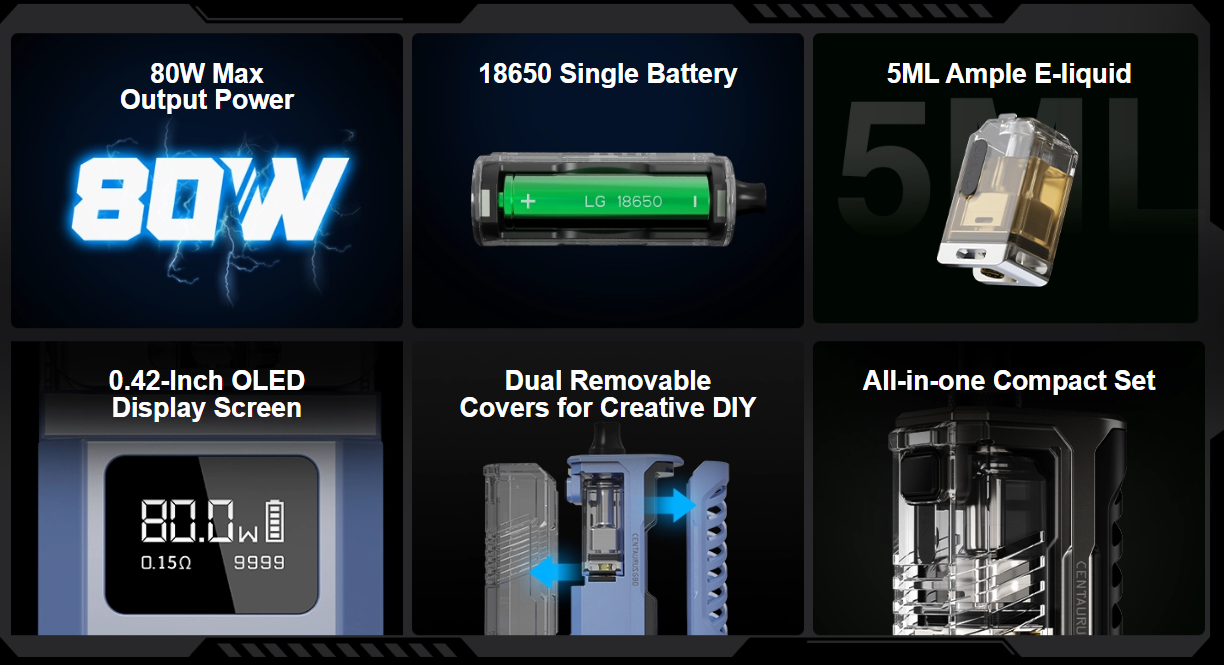 Lost Vape Centaurus G80 AIO Vape Kit, 5-80W çıkış gücü, değiştirilebilir 18650 bataryası ve UB Ultra coil sistemi ile güçlü buhar ve aroma deneyimi arayanlar için yüksek performanslı bir cihazdır. Yan dolum pod/tank sistemi, OLED ekran ve metal gövde ile estetik ve kullanışlı bir vaping deneyimi sunar.