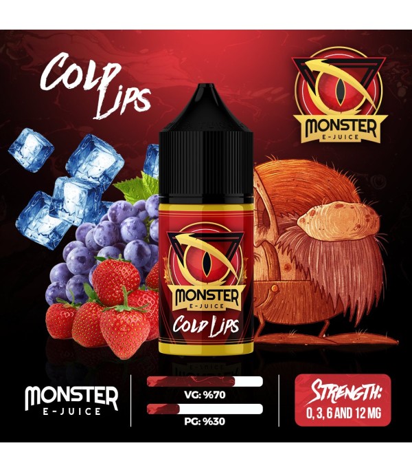 Monster Cold Lips E-Likit, çilek, üzüm ve buz aromalı likit şişesi.