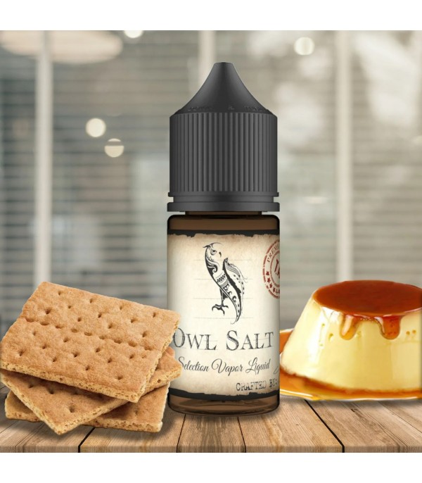 Owl Vape Custard King Salt Likit şişe, kraker ve karamelli krema aromaları.