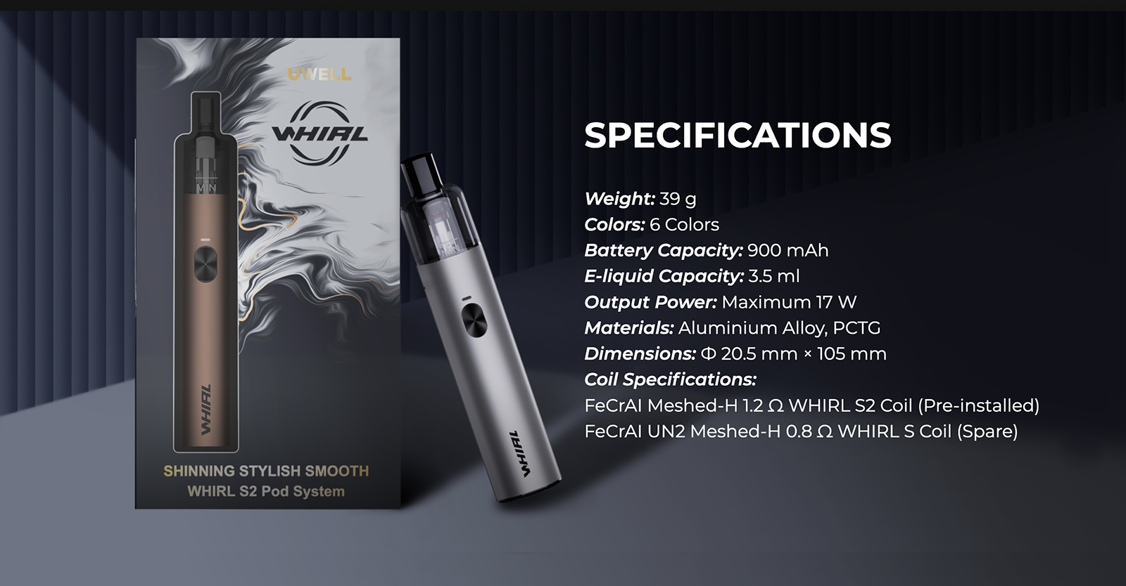 Uwell Whirl S2 Pod Mod, 900mAh pil kapasitesi, 3.5 ml salt likit depolama kapasitesi ve maksimum 17W çıkış gücü ile uzun süreli bir kullanım deneyimi sunar.