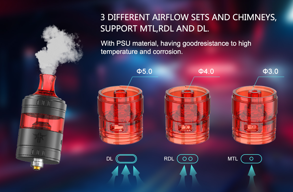 Büyük e-likit kapasitesi ve yenilikçi hava akışı ile tasarlanmıştır . 3 hava akımı seti ve bacası vardır ve MTL, RDL ve DL elektronik sigarayı destekler. Aynı zamanda RDA benzeri bir deneyim için doğrudan yandan hava akışına sahiptir.