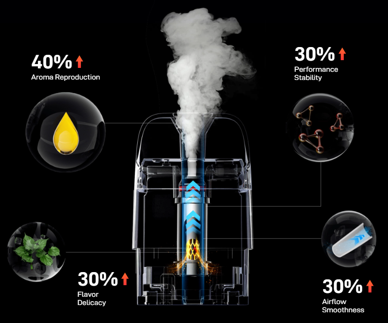 • Corex 2.0 pod kartuşlar uyumlu (0.6 Ohm, 0.8 Ohm, 1.0 Ohm, 1.2 Ohm mesh coil seçenekleri) — aroma ve buhar dengesi