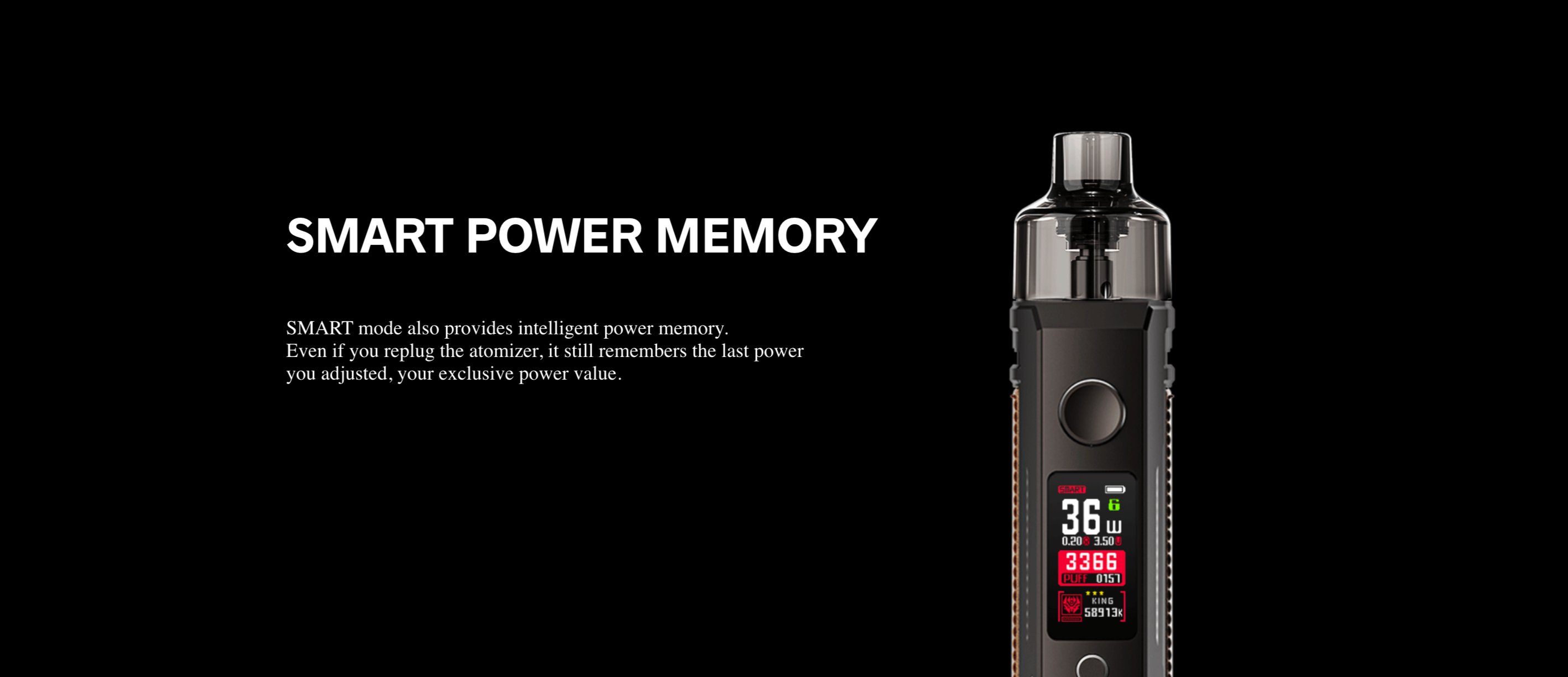 Voopoo Drag S Pod Mod60W’a kadar güç çıkışı sağlar. Ayrıca, deri ve metalin kusursuz birleşimi sayesinde hem dayanıklı hem de şık bir görünüm kazanmıştır.
