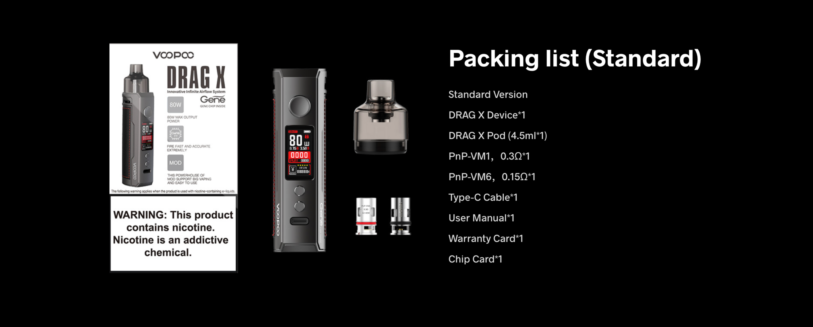 DRAG'ın klasik sembolü, son derece hızlı ikinci emiştir, DRAG X bu soyu devam ettirir. Yeni GENE.TT yongası, 0.001 saniyelik bir ateşleme hızı ve 80W'a kadar güçlü bir çıkış ile daha büyük lezzetli buhar yapmanızı sağlar.