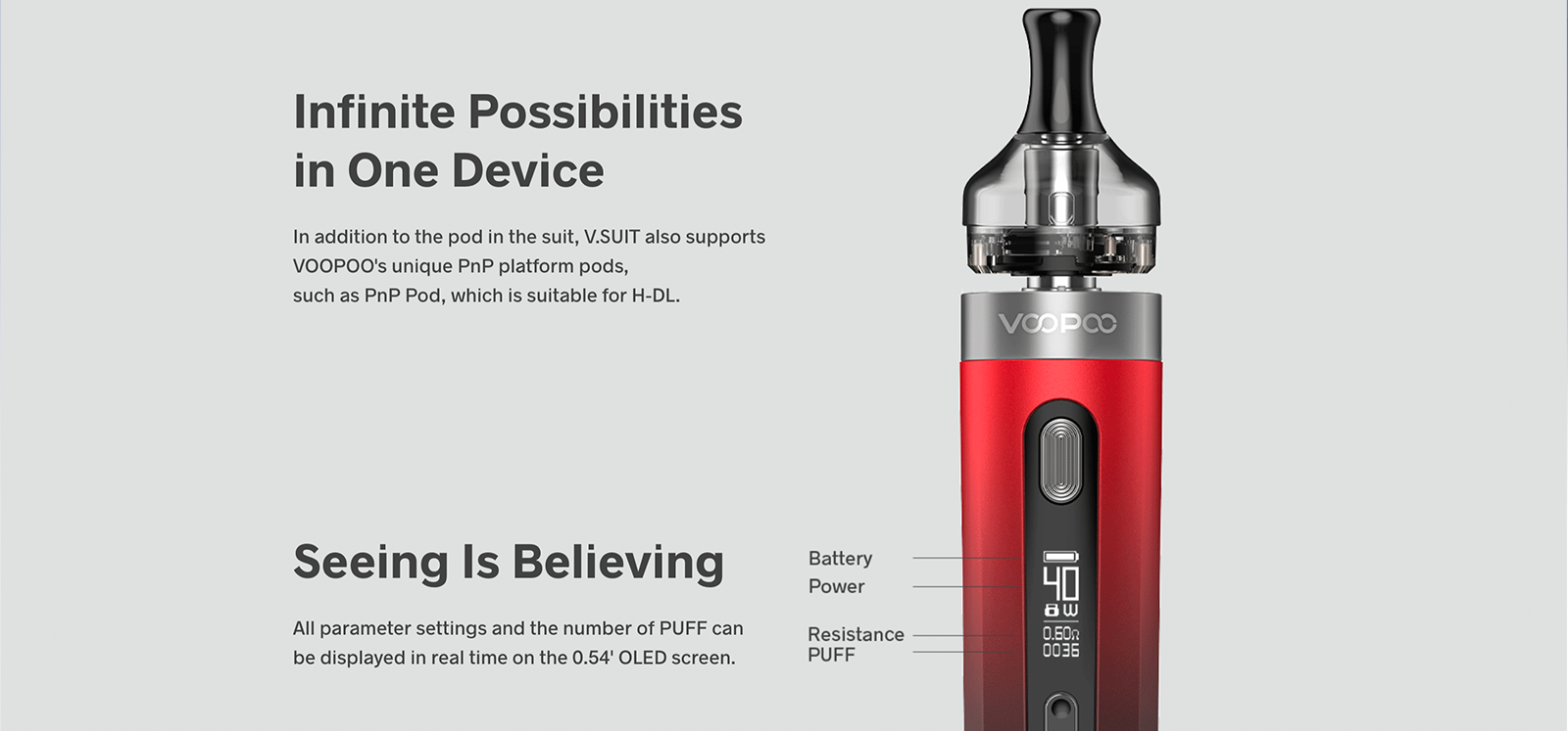 Voopoo V.Suit Pod Mod, 5-40 watt arasında ayarlanabilir çıkış gücü sunan cihaz, 1200mAh kapasiteli dahili bataryası sayesinde uzun süreli kullanım sağlar.