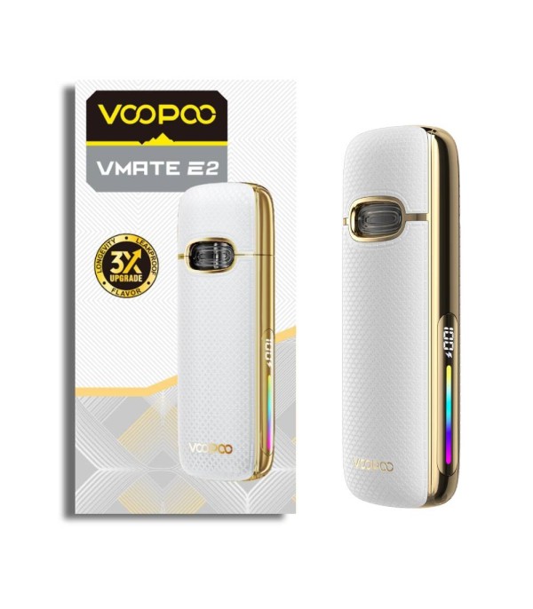 Voopoo Vmate E2 kutusunda şunlar yer alır: 1 adet Voopoo Vmate E2 cihaz gövdesi, 1 adet 0.4 Ohm üstten dolumlu kartuş, 1 adet 0.7 Ohm üstten dolumlu kartuş, 1 adet USB Tip-C şarj kablosu ve 1 adet kullanım kılavuzu. Cihaz ilk kullanım öncesi birkaç damla likit ile kartuş pamuklarını nemlendirdikten sonra kullanıma hazır hale gelir.
